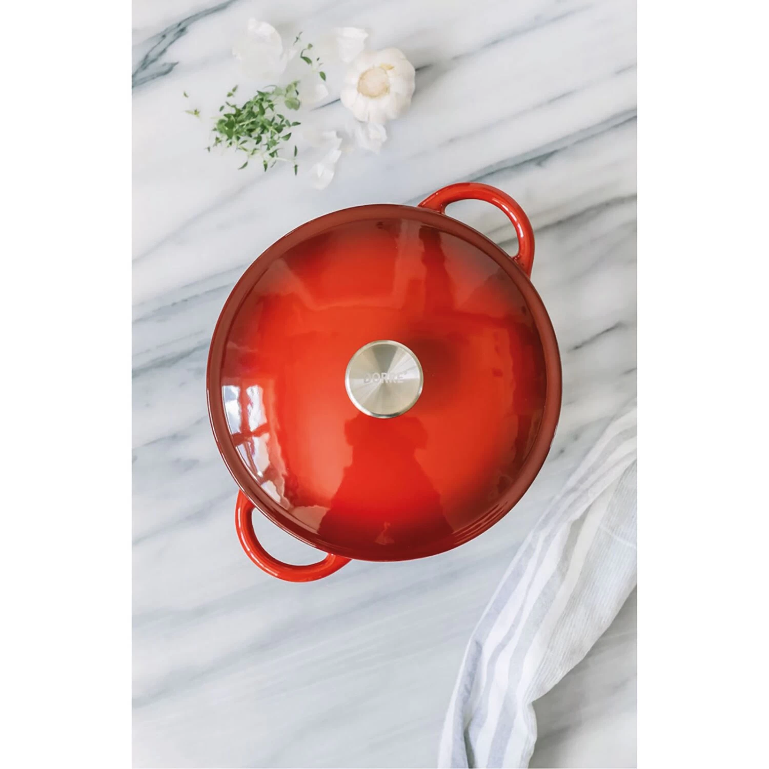 Gusseisentopf von Dorre mit dekorativem Griff aus Edelstahl. Kann auf jeder Art von Herd verwendet werden, auch Induktionsherde eingeschlossen.