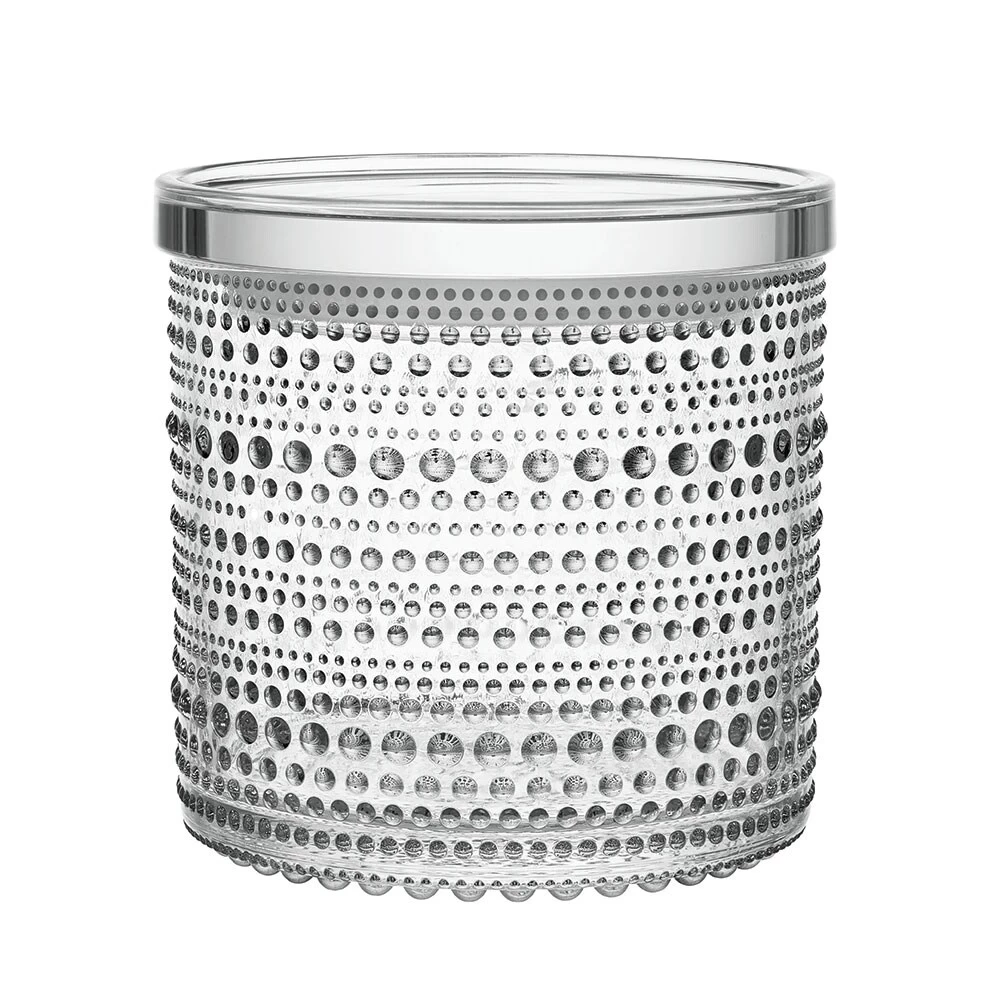 Wunderschönes AUfbewahrungsglasdose, entworfen von Oiva Toikka für Iittala. Diese besondere Kollektion ist eine der beliebtesten der Marke und seit ihrer Geburt im Jahr 1964 zu einem Klassiker geworden. Eine fantastische Kollektion mit kleinen Glasperlen, die von Tautropfen inspiriert wurden. Passt sowohl zur Aufbewahrung von Lebensmitteln als auch zur Aufbewahrung von beispielsweise Schmuck.