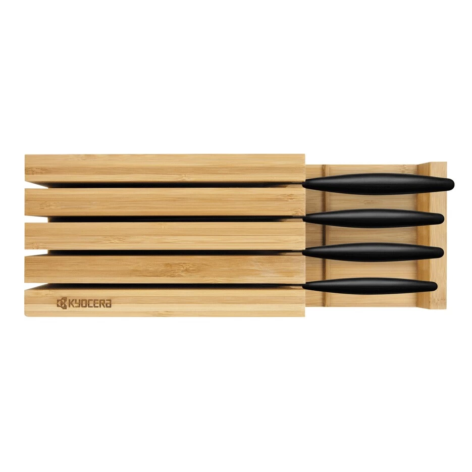 Messerblock aus Bambus mit Platz für bis zu 4 Messern. Für den Tresen, die Schublade oder um montiert zu werden. Für alle Messer mit einer Klingenlänge bis zu 22 cm.