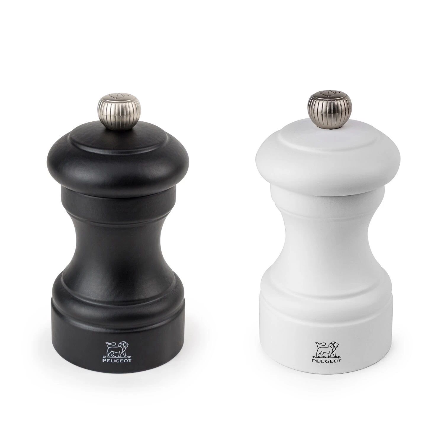 Salz- und Pfeffermühlen Set. Die eine Mühle ist Weiss, die andere Schwarz 10cm.