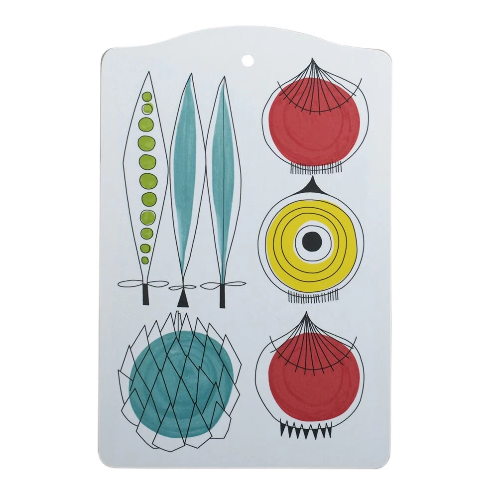 Picknick Zwiebel ist ein Retro-Schneidebrett mit einem Muster von Marianne Westman. Dieses Schneidebrett hellt jede Speisekammer mit seinem bunten Motiv auf.